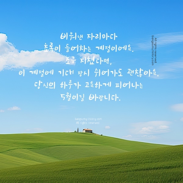 예: “5월의 햇살처럼 따뜻함이 가득한 하루 되세요.” - “이 계절에 당신의 [감정]도 함께 [긍정적 변화]하길 바래요.”